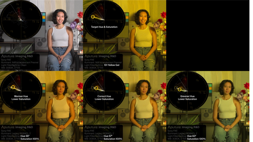 Have you ever tried to dial in a color setting into an LED fixture by eye to your taste, but encountered a completely different result in your camera monitor? Your eyes lied to you! Or, so it seemed, even after you tried your best to dial in your desired color. You may have even swapped out your RGB LED fixture for another LED technology, RGBACL, to address the problem, but still failed to dial it in. The bottom right image could have been your best option, no matter how you dialed in the emitters.