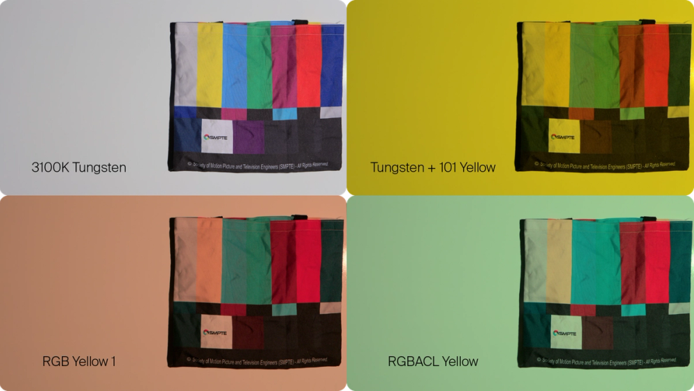 Figure 1: This example shows an ideal yellow light on the top right, and how an RGB fixture may appear to one’s eye on set. But, cameras invariably will see it as the below left frame.