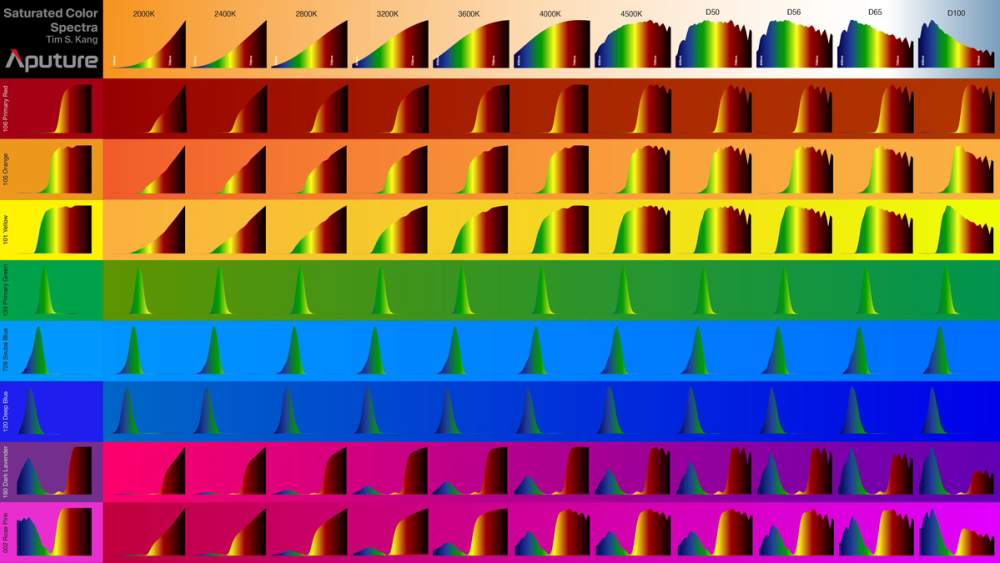 Figure 16: Each column represents the example spectral fingerprints needed to provide the saturated color in camera for the given CCT setting in camera listed at the top. For example, at 3200K, a camera “expects” the yellow spectrum in the yellow row within the 3200K column to properly map the color “yellow” for display.