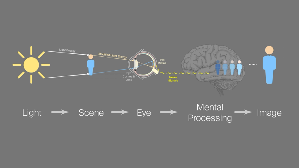 A chart that shows light entering your eyes and processing an image